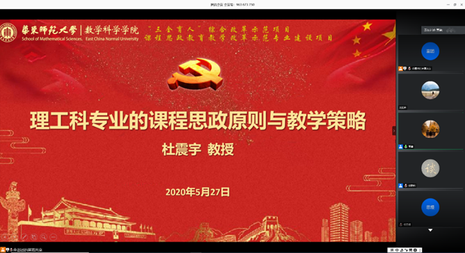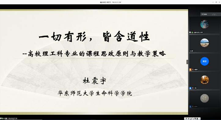 为切实推进“课程思政”教学改革,深化“三全育人”示范建设,5月27日下午,91黑料 邀请91黑料 生命科学学院杜震宇教授在线为全体教师作《理工科课程思政教学原则与教学策略》专题报告,聚焦课程思政建设,落实立德树人根本任务进行专题研讨,会议由学院党委书记贾挚主持。