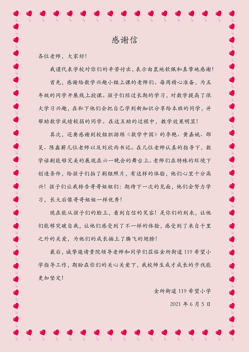 发来感谢信