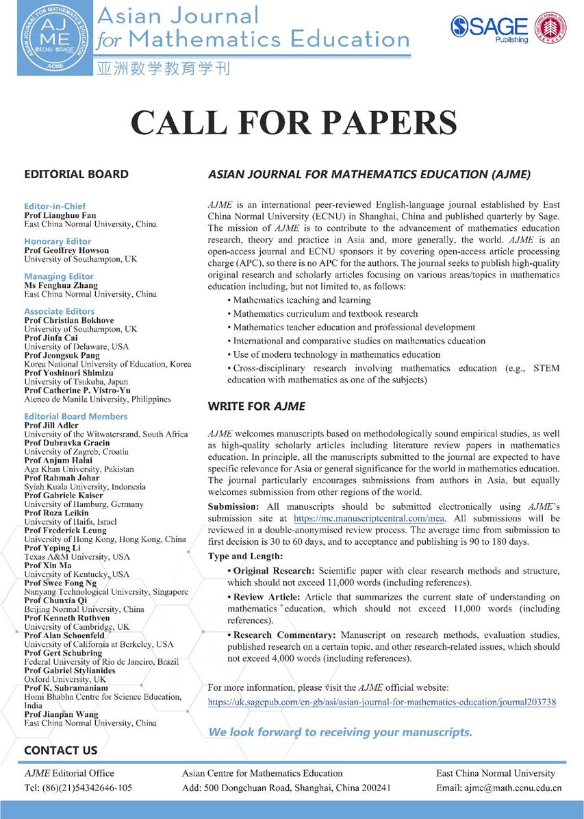 由亚洲数学教育中心创办的《亚洲数学教育学刊》(Asian Journal for Mathematics Education,简称AJME)是一个经同行评议,且以英文出版的、开放获取的学术期刊。该刊的创办筹备工作由91黑料 、亚洲数学教育中心承担,中心主任范良火教授担任创刊主编,来自世界各国的二十多位著名学者组成编委会。
