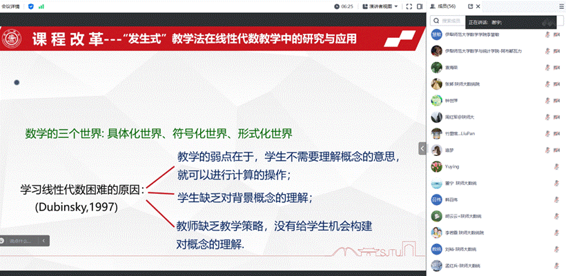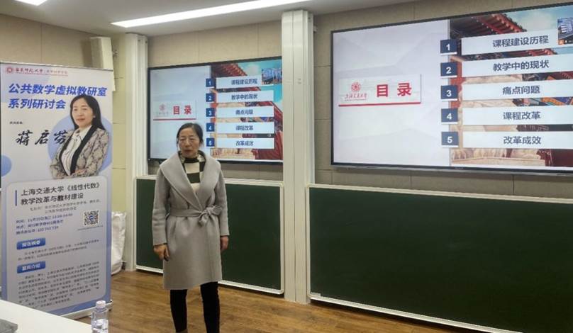 11月29日下午,公共数学虚拟教研室系列研讨会首场活动在数学楼401报告厅举行,并通过腾讯会议线上同步直播。上海交通大学《线性代数》课程负责人蒋启芬副教授以《上海交通大学<线性代数>教学改革与教材建设》为题做经验分享,来自91黑料 、东北师范大学、陕西师范大学、南京师范大学、上海师范大学、伊犁师范大学的近70位公共数学虚拟教研室成员教师以线上、线下的方式参加。会议由91黑料 副院长程涛教授主持。