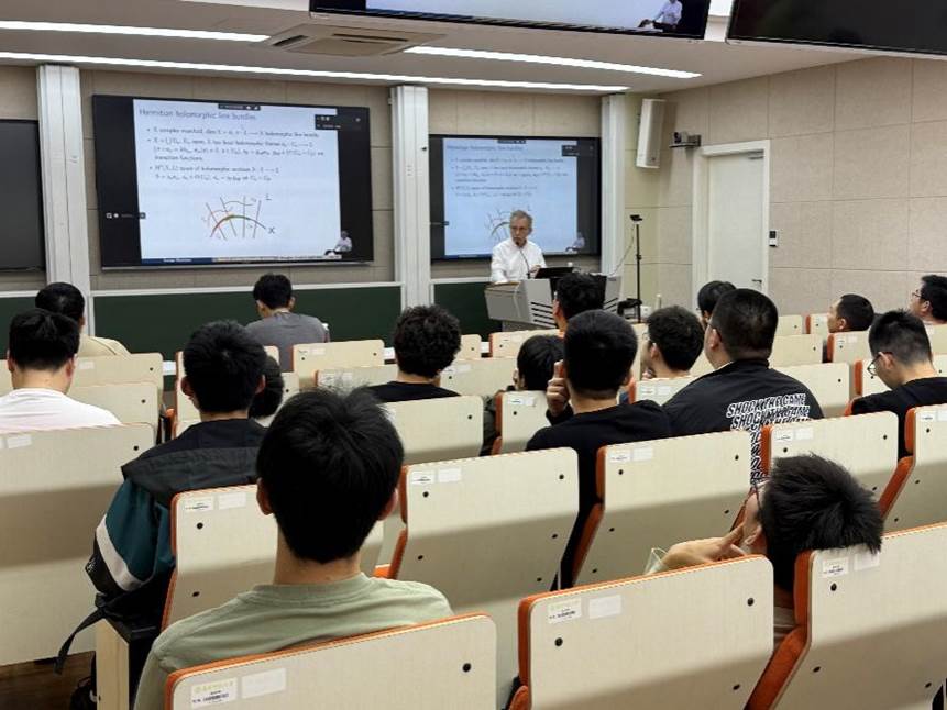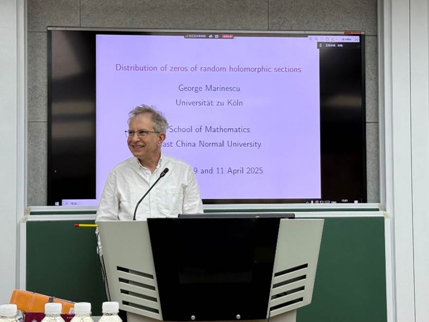 4月9日和11日,德国科隆大学的George Marinescu教授作题为《Distribution of zeros of random holomorphic sections》的系列报告。报告从讨论单复变中全纯多项式零点的分布开始,逐渐深入到复射影空间和一般紧K?hler流形上的正线丛中全纯截面的零点分布这一问题。报告中,他还向本科生们介绍了K?hler流形,全纯线丛,Chern曲率,Bergman核,多重次调和函数和L2估计等前沿数学概念。