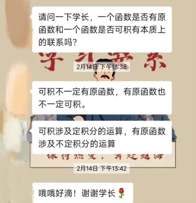 活动共有60余人次本科生参与,打卡科目涵盖了《数学分析》《高等代数》《常微分》等多门数学专业核心课程。同时基础数学博士生党支部组织党员同志成立寒假答疑志愿者团队,在打卡群内为同学们实时答疑。在三周多的打卡过程中,参与的同学们展现出高度的自觉性。许多同学表示,每日打卡不仅帮助他们理清学习脉络,更在群体打卡活动中激发了学习动力,志愿者老师们的答疑也帮助他们更快处理学习路上遇到的困难。同时打卡学习这种“云陪伴”让同学们学习不再孤单。