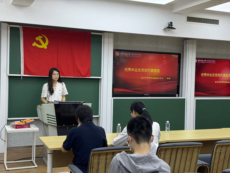 优秀毕业生党员代表杨琇则从四年前怀揣梦想步入校园讲起,回顾大学期间在党组织的培养下逐渐成长的历程。她强调党员身份的光荣和责任,号召毕业生党员在今后的工作和生活中牢记“全心全意为人民服务”的宗旨,迎难而上,勇于担当,争做新时代的奋斗者。