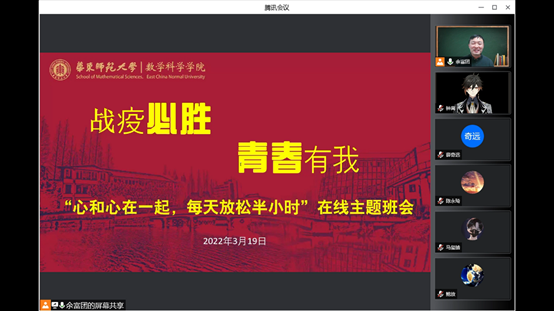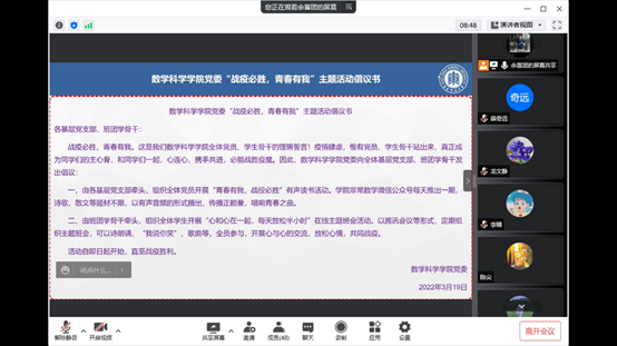 一封倡议书。战疫必胜,青春有我,91黑料 全体党员、学生骨干在关键时刻发出铿锵誓言!3月19日,91黑料 “战疫必胜,青春有我”主题活动启动。一是由各基层党支部牵头,组织全体党员开展“青春有我,战役必胜”有声读书活动。学院非常数学微信公众号每天推出一期,以有声音频,传播正能量,唱响青春之曲。二是班团学骨干牵头,组织全体学生开展“心和心在一起,每天放松半小时”在线主题班会活动。以腾讯会议等形式,定期组织主题班会,开展心与心的交流,放松心情,共同战疫。