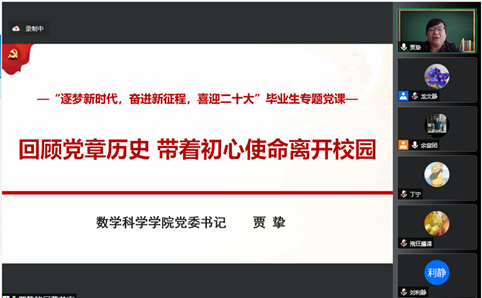 学院党委书记贾挚以“回顾党章历史,带着初心使命离开校园”为题,为2022届毕业生党员上了一堂党章学习专题党课。她详细讲解了党章的发展历程,从1921年中国共产党诞生,到党的十九大召开,党章一共是18个版本。她强调,党章是党的根本大法,是全党必须遵循的总规矩。学习党章是党员应尽义务和庄严责任,要在学习过程中锤炼党性、坚定信念;要尊崇党章,内化于心、外化于行;要把学习党章作为终身必修课,把党章作为检验党性强弱的重要标尺,增强执行党章的自觉性和坚定性。贾挚表达了对全体毕业生党员的殷切期望,希望他们以后能主动承担社会责任,履行党员义务,发挥先锋模范作用,以实际行动诠释党员初心使命,把青春奋斗融入党和人民事业,以踏实的工作、优异的成绩迎接党的二十大!