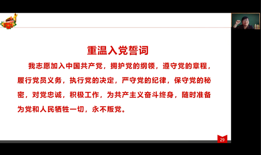 随后,贾挚带领全体毕业生党员重温了入党誓词。毕业生党员们以铿锵有力的宣誓,表达了作为一名党员,时刻不忘初心、矢志奋斗的决心,以及坚定的政治信仰。