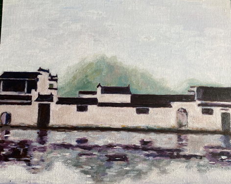 闫子轩同学的作品《水墨之乡》呈现了徽派民居的建筑风格,隐隐约约间可见远处的崇山峻岭,用细腻的笔触生动描绘了江南水乡的秀美与静谧。刘娜同学的作品《塞上风云》里褐红色的大漠搭配上碧澄的蓝天,庙楼耸立,深邃辽阔,展现出西部大开发后推动环境治理、区域协调发展的伟大成果。