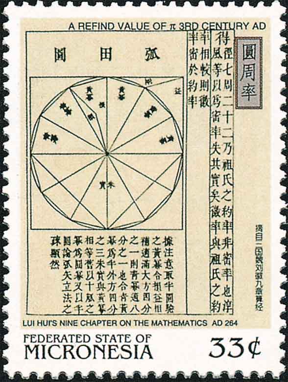 图3是东汉科学家张衡(78-139), 他在天文测量中得出圆周率π的两个近似值3.1466和3.1623, 这比印度和阿拉伯人早了500年. 图4是魏晋时期数学家刘徽(公元3世纪, 山东人, 图5是山东邮政刻制的首日纪念邮戳). 他在《九章算术·圆田术》注中, 用割圆术得出圆面积与周长的关系式和圆周率的计算方法(参见图6中上部和图7, 它们分别是中国邮资明信片和密克罗尼西亚邮票). 由此得到π=3927/1250=3.1416, 通称它为“徽率”. 请注意刘徽在割圆术中提出的“割之弥细, 所失弥少, 割之又割以至于不可割, 则与圆合体而无所失矣”, 这种计算思想就是当今的极限概念. 图8是南北朝时期数学家祖冲之(429-500, 中国小型张), 他则更计算出圆周率π在3.1415926和3.1415927之间, 并给出π的两个分数近似值: 约率22/7和密率355/113. 这些都比欧洲人早了一千年.