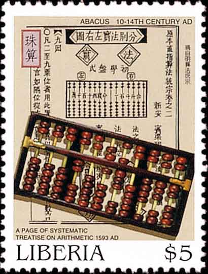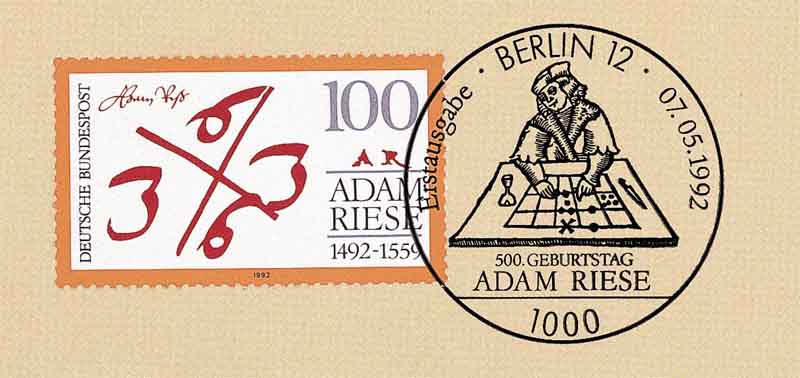 4. 其他国家在早期也出现过类似的计算工具, 比如在木板上刻了纵横线纹(称为算板), 上面放置小卵石或其他特制的小器物(称为算子)来记数和计算. 图7中的邮戳显示德国数学教育家里斯(Adam Riese 1492-1559)研制的算盘.
