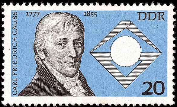 高斯(Carl Friedrich Gauss, 1777--1855)是德国著名的数学家、物理学家、天文学家、大地测量学家。由于他在数学领域上的诸多重大贡献而被誉为数学王子 (图1为1955年原联邦德国纪念高斯逝世100周年邮票)。