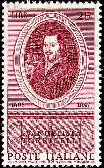 表示的计算公式。1635年意大利的卡瓦列利(Cavalieri,Francesco Bonaventura,1598-1647)出版了《不可分量几何学》,他将面积的不可分量比作一块布的线, 体积的不可分量比作一册书的各页,而且不可分量的个数是无限的,且没有厚薄与宽窄。意大利的托里拆利(Evangelista Torricelli, 1608-1647, 图4是意大利纪念托里拆利诞生350周年邮票)进一步发展了卡瓦列利的“不可分原理”,提出了许多新定理,如:由直角坐标转换为圆柱坐标的方法; 计算有规则几何图形板状物体重心的定理; 在水平内的以一定速度抛出物体所描绘的抛物线上作切线的问题; 还研究了物体所描绘的抛物线的包络线; 他还测定过抛物线弓形内的面积; 抛物面内的体积以及其他复杂的几何难题。