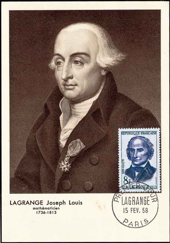 随着微积分的创立,常微分方程问题也就出现了。实际上,牛顿(Newton,1642-1727,图见本刊2009年第6期)第二定律的数学模型就是一个二阶常微分方程式。 到1740年左右,人们已经知道了几乎所有求解一阶方程式的初等解法。1728年,瑞士人欧拉(Euler, 1707-1783,图1是1957年瑞士纪念欧拉诞生250周年发行的邮票)给出指数代换法, 将二阶常微分方程化为一阶方程来求解。从而开始了对二阶常微分方程的系统研究。1743年,欧拉又给出了高阶常系数线性齐次方程的完整解法,这是对高阶常微分方程的重要突破。 1774-1775年间,法国的拉格朗日(Lagrange,1736-1813,图2是1958年应用法国为拉格朗日逝世145周年发行的纪念邮票所制作的极限明信片)提出了用常数变易法求解一般高阶变系数非齐次常微分方程。