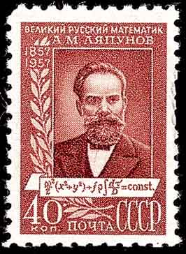 19世纪,法国的柯西(Cauchy,1789-1857,图3是1989年法国纪念柯西诞生200周年发行的邮票)相继开展对常微分方程解的存在性理论问题和与奇点问题相联系的解析理论研究。 随着法国的庞加莱(Jules Henri Poincaré,1854-1912,图4是1952年法国纪念庞加莱逝世40周年发行的邮票)和克莱因(Felix Klein,1849-1925)关于自守函数理论的研究使常微分方程解析理论的研究达到高峰。 同时庞加莱还开创了对常微分方程定性理论的研究。庞加莱关于在奇点附近积分曲线随时间变化的定性研究,为当今动力系统理论奠定了坚实的基础, 且在1892年以后被俄国的李雅普诺夫(Александр Михайлович Ляпунов,1857-1918,图5是1957年前苏联纪念李雅普诺夫诞生100周年发行的邮票)发展到一般高维情形而形成专门的“运动稳定性理论”分支。 李亚普诺夫的工作使微分方程的发展出现了一个全新的局面。1937年,俄国的庞特里亚金(Лев Семёнович Понтрягин,1908-1988)提出结构稳定性概念,要求系统在微小扰动下保持其稳定性不变。 此外,前苏联科学院院长克尔德什(Мстислав Всеволодович Келдыш,1911-1978,图6、7是1981年前苏联纪念克尔德什诞生70周年发行的邮品)对常微分方程边值问题的研究也多有贡献。