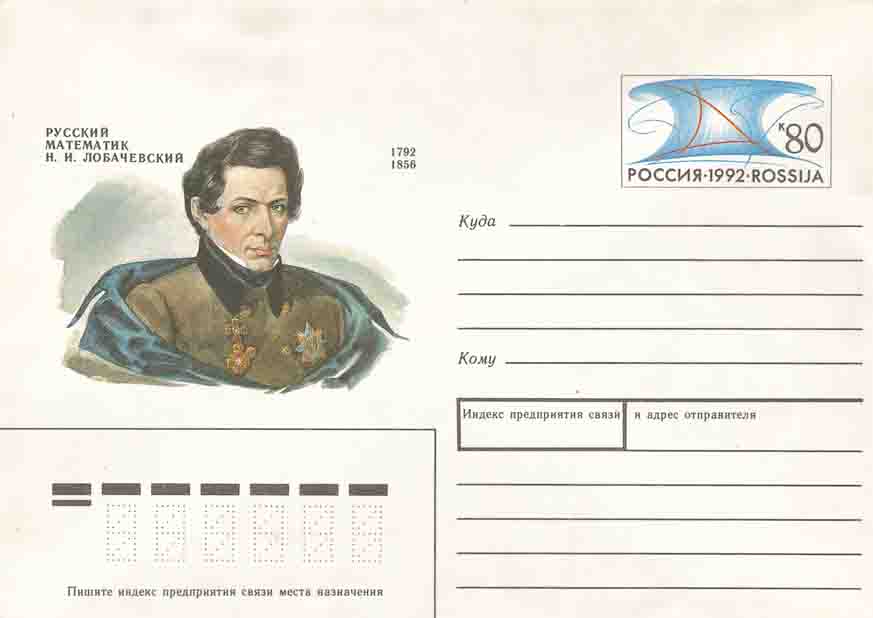 图 3 是俄罗斯在 1992 年发行的纪念罗巴切夫斯基诞生 200 周年的邮资信封.