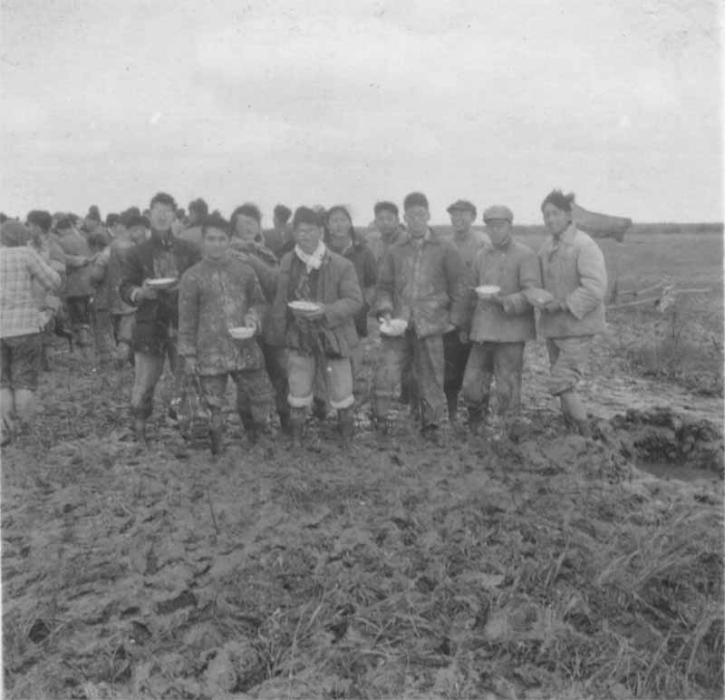 你看:迎风站立的这一排“雄赳赳”手拿饭碗的学生与背景,就是当时围垦“战士”与工地的写真。记得开工第一天,后勤跟不上,不干吧冷,干吧饿, 一直等在工地上“埋锅造饭”到下午二点多才开粥,那真是饥寒交迫啊!后来常溪萍校长惦着大家艰苦,专门派总支书记刘维南送来“咸肉菜饭”。 这一顿夜饭,在当时围垦高校中传为美谈,可把交大、复旦等校的“战士”们“馋煞”哉!