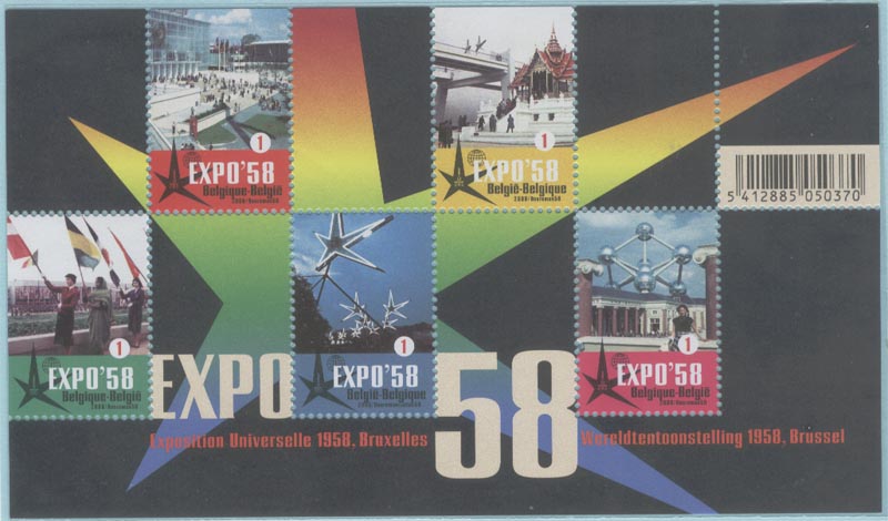 50年后的2008年比利时发行了一枚包含5枚邮票的小型张(图17)以纪念50年前的世博盛会,展现当年的风采。