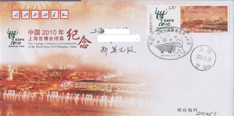 图 67(贴“邮彩联票”,从世博园内寄出的纪念封)