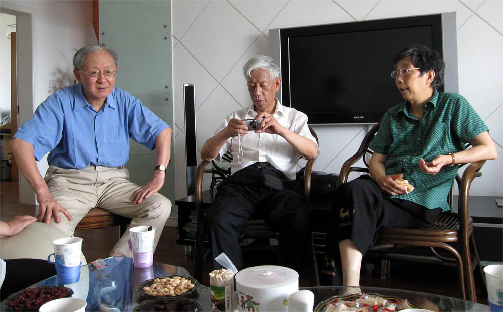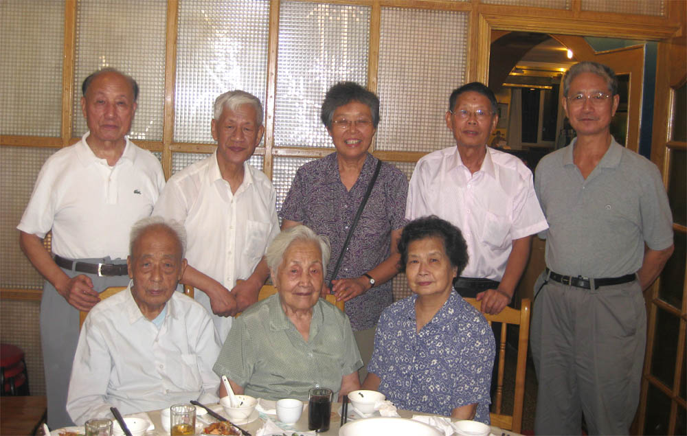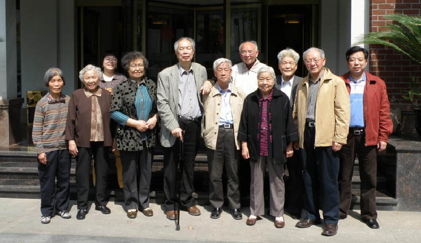 自左至右:吴珠卿、江素贞(张奠宙夫人)、吕忆秋(倪明夫人)、唐瑞芬、张奠宙、郑英元、陈信漪、吕乃刚夫人、吕乃刚、胡启迪、 倪明(2010-5-2)