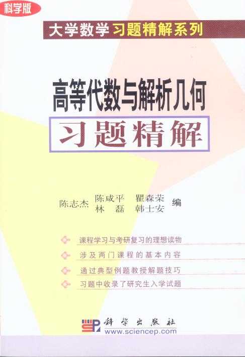 《高等代数与解析几何习题精解》已于2002年2月正式出版。该书系大学数学习题精解系列书中的一本,由陈志杰,陈咸平,林磊,瞿森荣和韩士安编写,科学出版社出版。ISBN 7-03-009804-8。字数:65万。定价:39元。用B5纸印刷。页数:563。